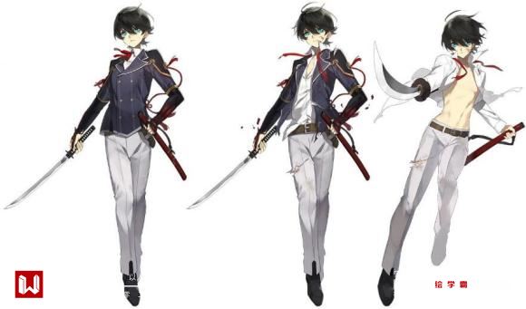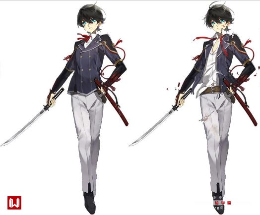 类似这样的站姿在人物立绘中也非常常见,也同样是这样方法来画出褶皱。比如《刀剑乱舞》中掘川的人物立绘。