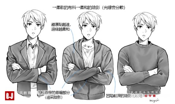 依质料不同,阴影(例如摺痕之间的宽度)在柔软阴影和亮部之间会发生变化,如果想追求更高的作品完成度,建议多多接触各种材质并加以研究,丰富自己的知识。