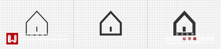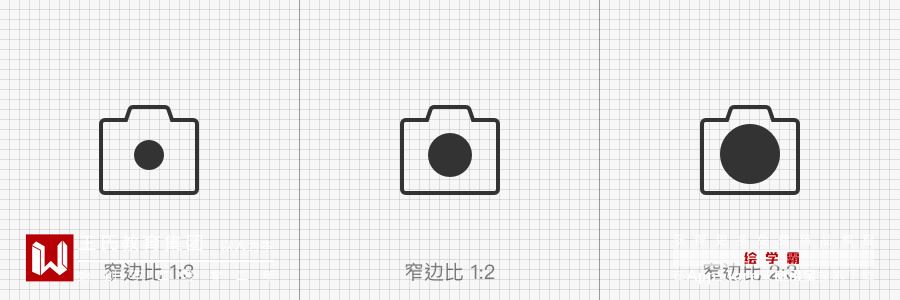 线面比例的差异,图形呈现出来的张力也会有不同的感受。基于中间填充的图标形态尝试了三种不同的比例,从下图中可以看出,当填充与外形窄边比为 1 : 3 时(左图)图标呈现往内收的感觉;填充与外形窄边比为 1 : 2 时(中间)图标整体较为平衡;当填充与外形窄边比为 2 : 3(大于1:2)时(右图)整体具有外扩趋势。