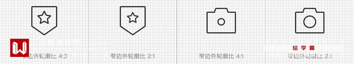 组合型的比例会影响到图标的精致程度,准确的 「比例值」 能让整体的造型趋向平衡,更具有美感。如下图案例尝试了两组不同比例的效果,这里以图标窄边作为 「基准值」 进行尝试。当内形为外形的 1 : 2 时(下图2),图标的整体视觉效果较为平衡;当大于 1 : 2 并接近 4 : 3 时,图标内部结构会显得过于饱满。而小于 1 : 2 并接近 4 : 1 时(下图3)则会产生稀疏不紧凑的效果。(这里的比例只是案例需要,实际设计以最终的视觉感知为准)