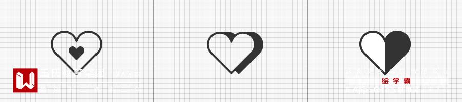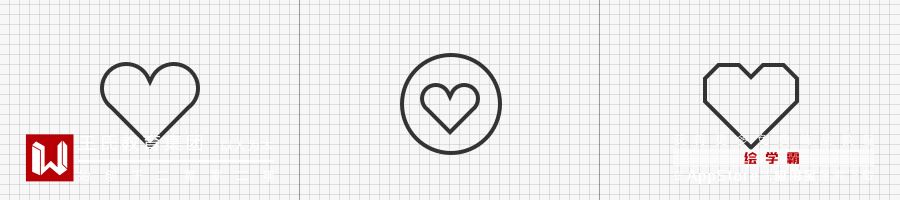 如下面的 「心形」 图标,下左图是我们具有普识性的图标,与圆形组合之后依然保持着原有的形态美感。但我们不时也会看到第三种设计,整体外形虽然保持着爱心,但为了与整体风格「一致」 强行对外轮廓进行切割,与原图形在美感上则稍微有些出入,这也是我们需要思考的关键点。