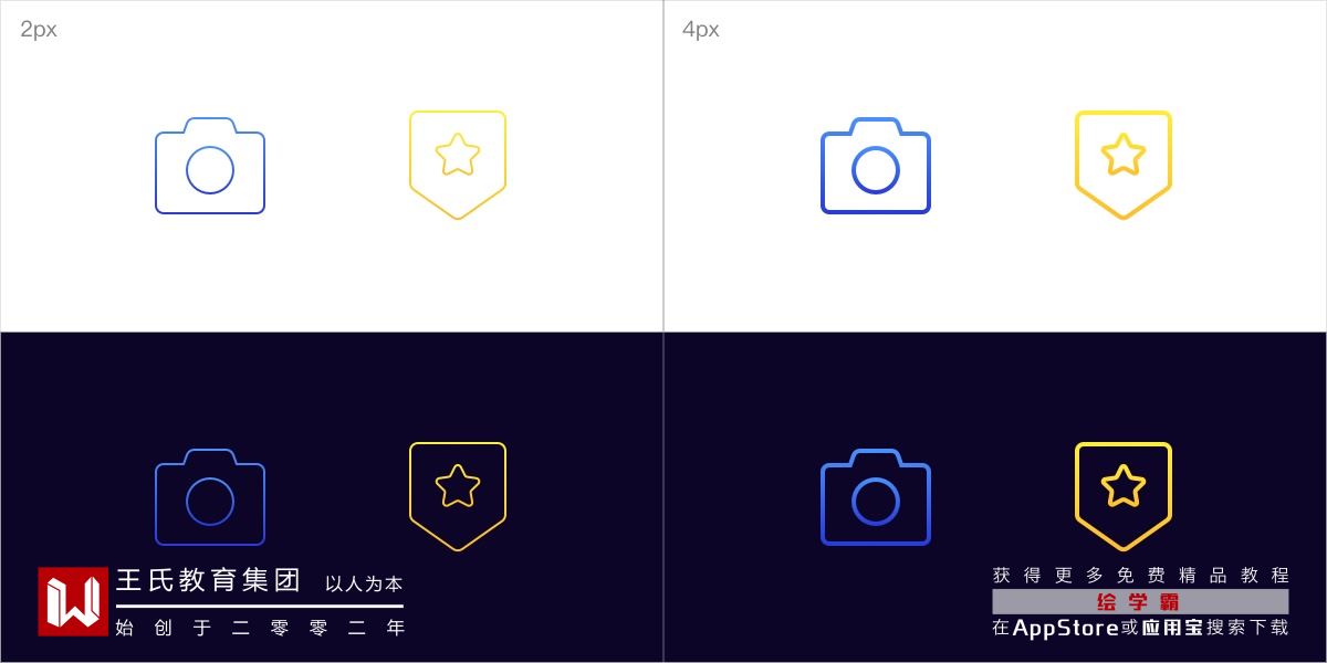 结合渐变的颜色,丰富了整个图标的视觉表达,并提升了图标的视觉冲击力和设计感。案例结合黑白背景作为尝试,白底:粗线比细线的视觉效果相对较好,渐变也能较为清晰地被表达;黑底:细线比粗线的视觉效果显示得更加精致和具有锐度感。