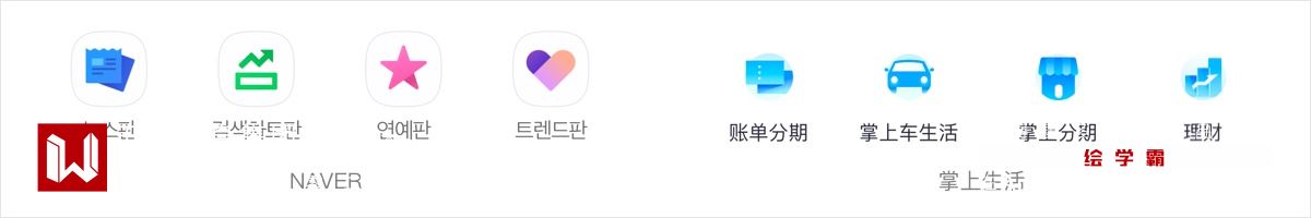 黑白色作为主色调,结合品牌色作为点缀色。与常规的黑白图标相比,既产生了变化,同时兼顾了品牌色的透出。