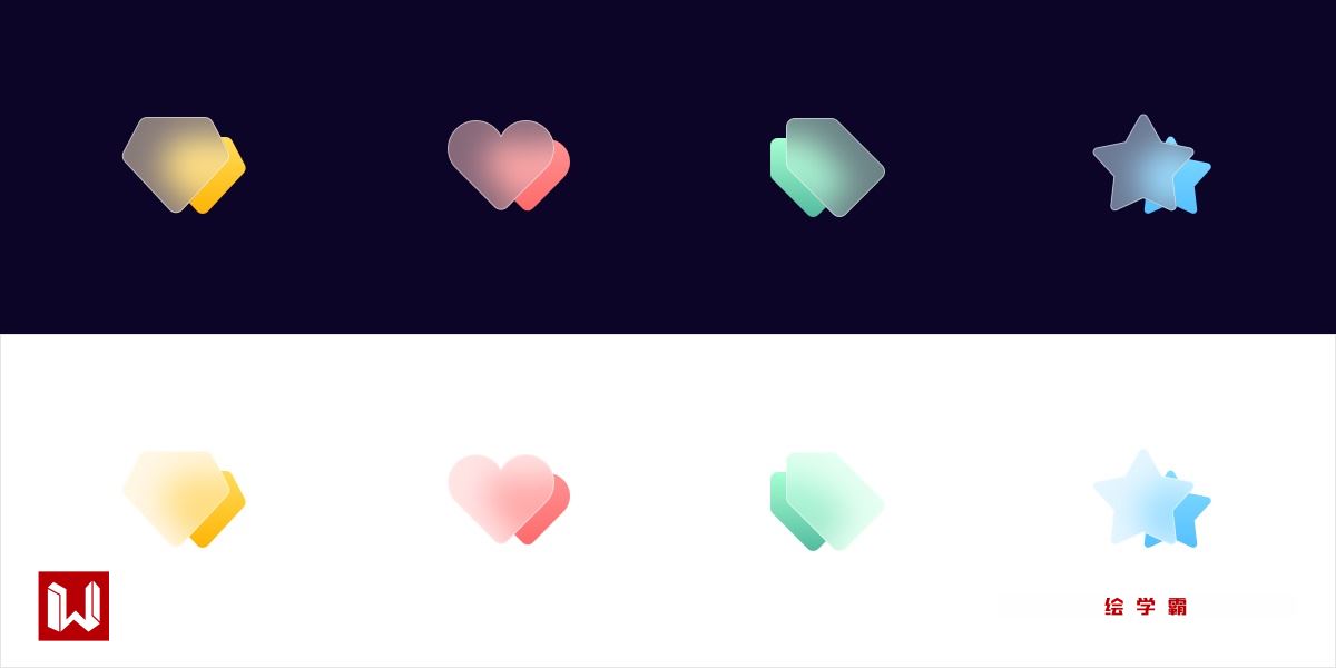 整体的效果与透明度变化的图标较为接近,通过渐变的深浅变化,使得形状的衔接处出现了明暗对比,因此图标也具有了厚度感和层次感。