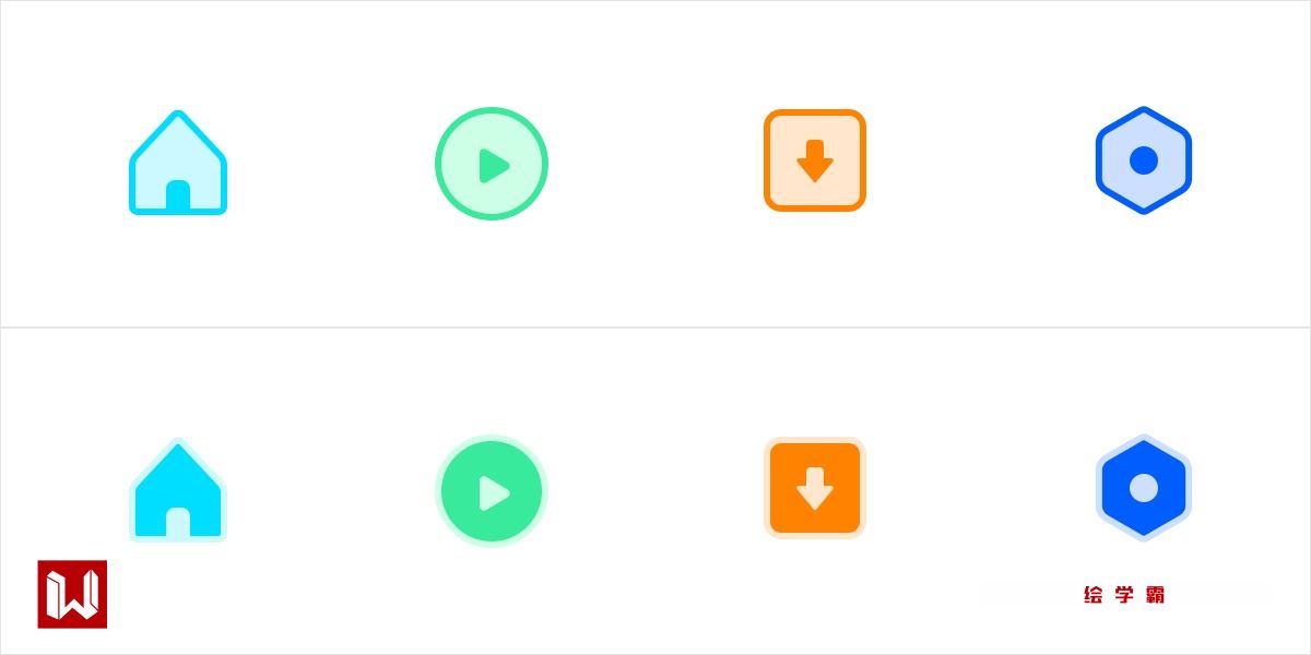 与「线面透明度变化」的设计方式大致一样。如下图案例,「弱线强面」的第一识别度较弱,而「弱面强线」 的外形识别度较高,也更符合图标的表达。