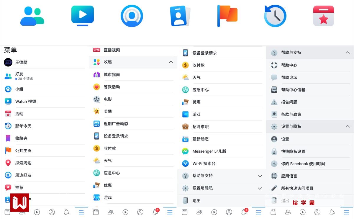 Facebook 更多页面的列表图标