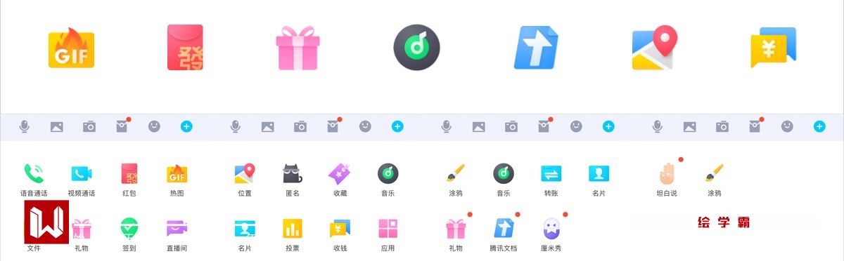 整体的外形使用统一的颜色,结合图标的属性感知使用不同的颜色进行点缀,通过点缀色提亮了图标的视觉效果,达到既统一又具有差异化。
