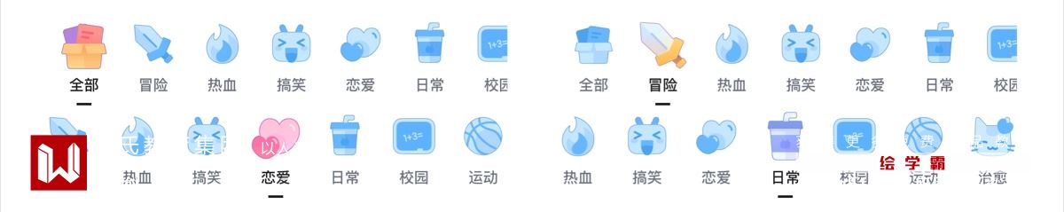 图标风格偏向卡通插画,选中态与默认态的设计较为巧妙。