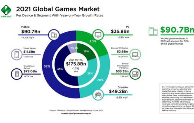 根据数据调研机构 Newzoo 的新报告,全球游戏市场规模将从 2021 年的 1758 亿美元增长...